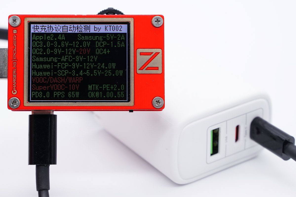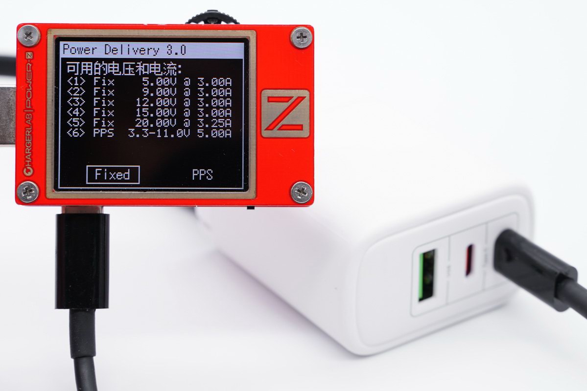 采用POWER-Z KT002 USB测试仪读取PDO报文,两个USB-C具有功率盲插功能报文完全相同。充电器基于PD3.0快速充电标准开发,带有5V3A / 9V3A / 12V3A / 15V3A / 20V3.25A五个固定电压输出档,另外还带有3.3-11V5A一组PPS电压子集。