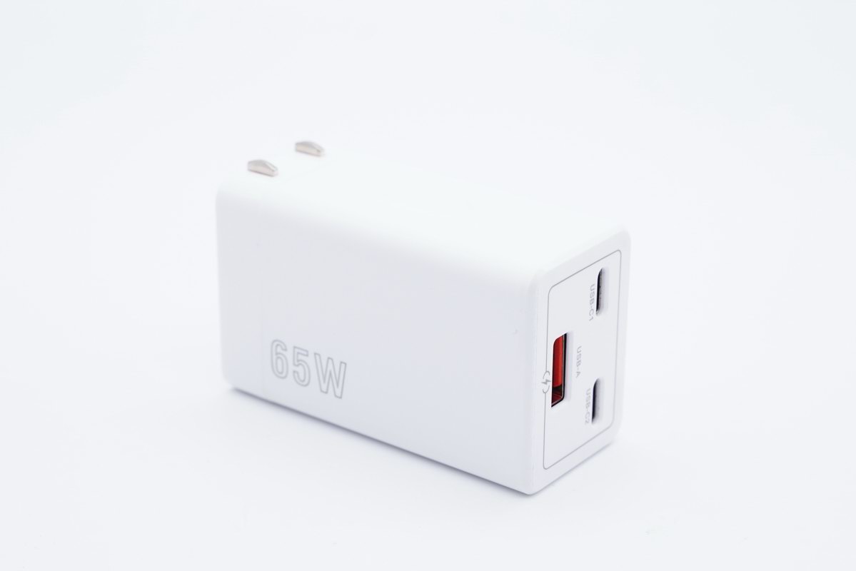 坤兴65W 2C1A快充充电器全白色壳体,搭配2C1A品字排列接口,看上去十分活泼。侧面印有65W功率标识表示最大输出功率65W,条形柱状高密度设计,小巧便携大功率,并支持多设备同时充电。