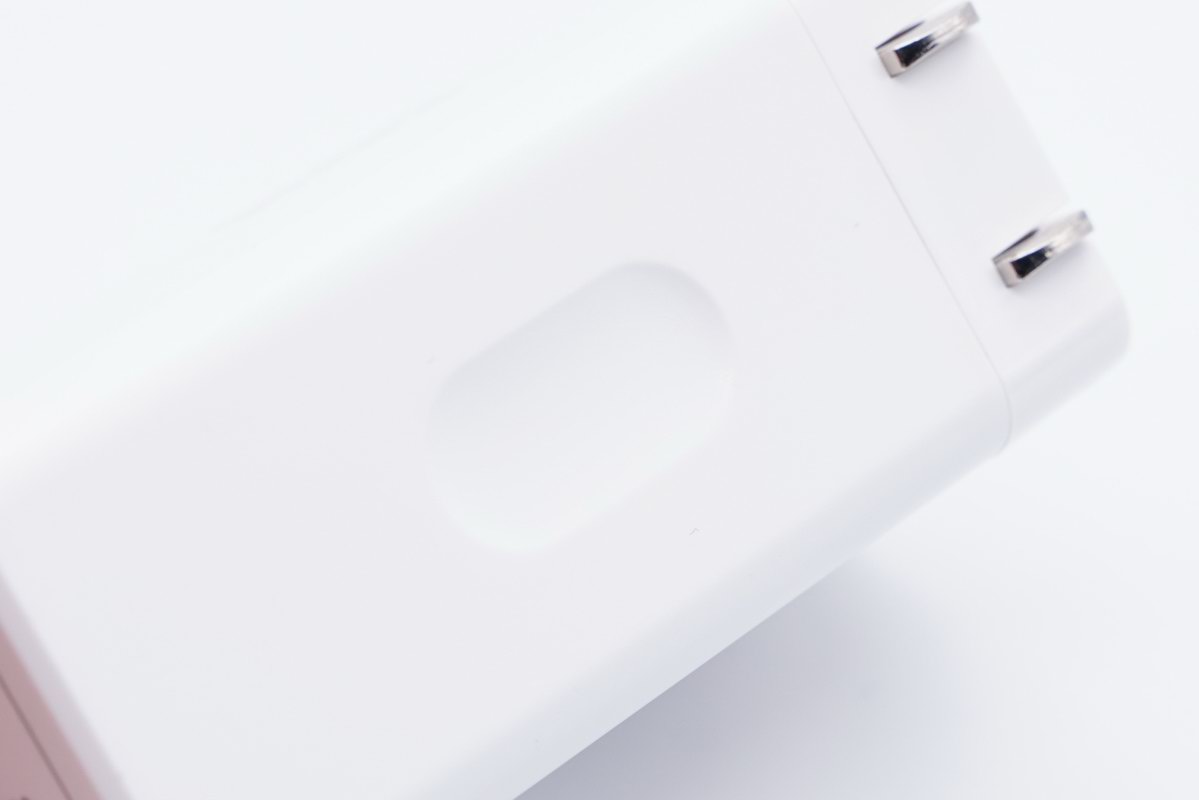 坤兴65W 2C1A快充充电器内部采用了高密度设计,体积远小于同级产品,使用千分尺实测三围分别是66.48mm X 40.48mm X 29.88mm,重量113.7g。按照65W额定输出功率计算,其功率密度为0.8W/cm³,与苹果61W充电器放在一起,体积优势十分明显,并且具有更多的接口,使用范围更广泛。