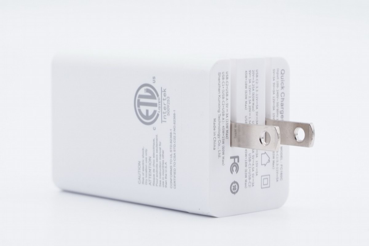 为方便用户携带,坤兴65W 2C1A快充充电器采用了可折叠插脚设计,类型为美规两脚,外出时插脚收纳至壳体内避免与行李刮蹭,外带更方便。