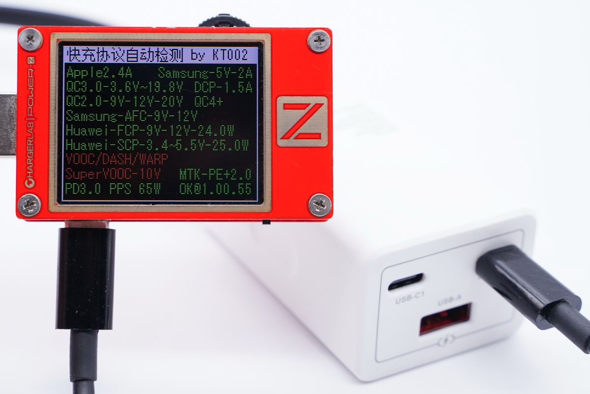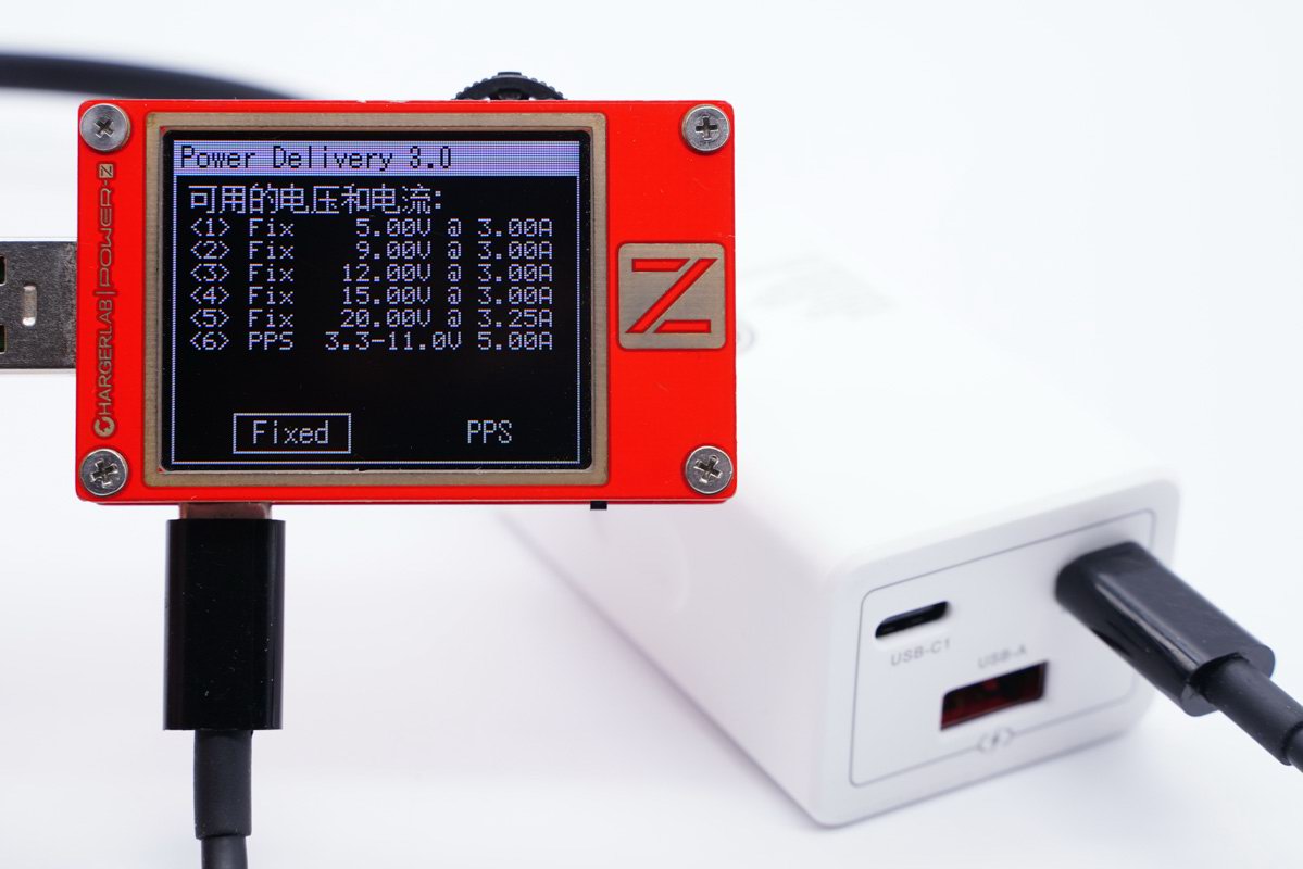 采用POWER-Z KT002 USB测试仪读取PDO报文,两个USB-C具有功率盲插功能报文完全相同。充电器基于PD3.0快速充电标准开发,带有5V3A / 9V3A / 12V3A / 15V3A / 20V3.25A五个固定电压输出档,另外还带有3.3-11V5A一组PPS电压子集。