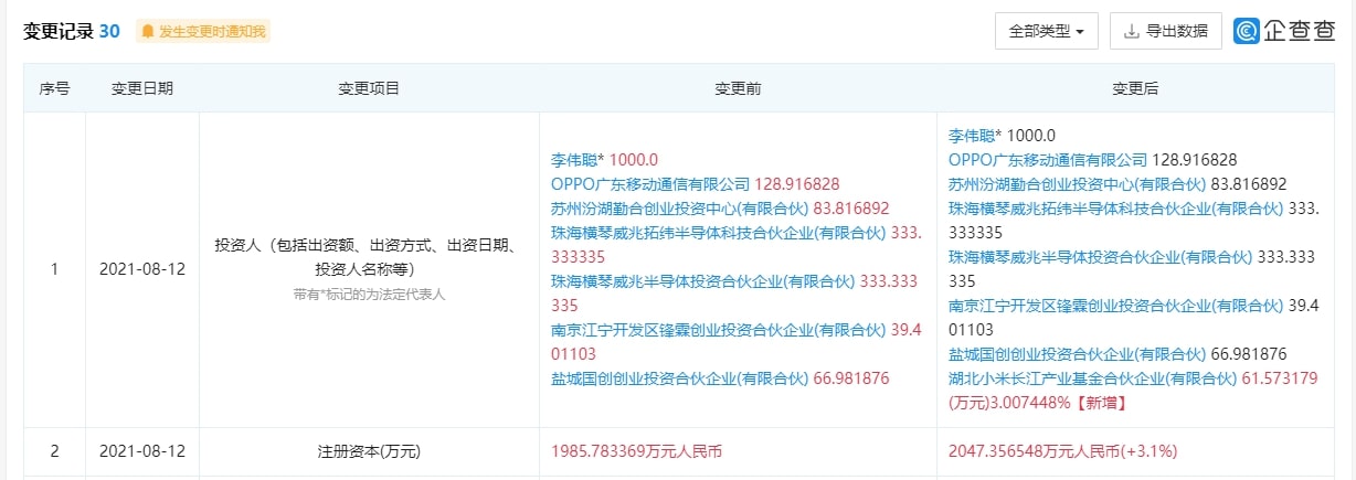 充电头网从企查查网站获悉,威兆半导体于8月12日发生工商变更,新增湖北小米长江产业基金合伙企业(有限合伙)。