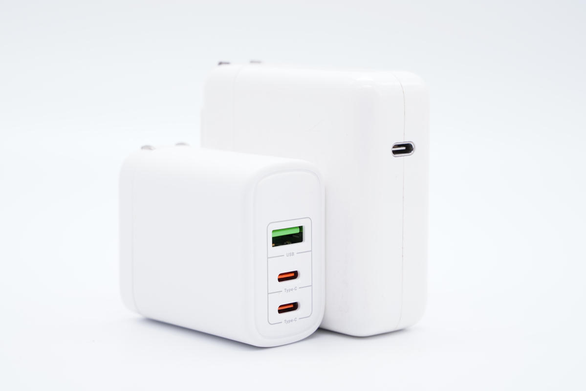 和苹果61W充电器直观对比,体积优势明显。