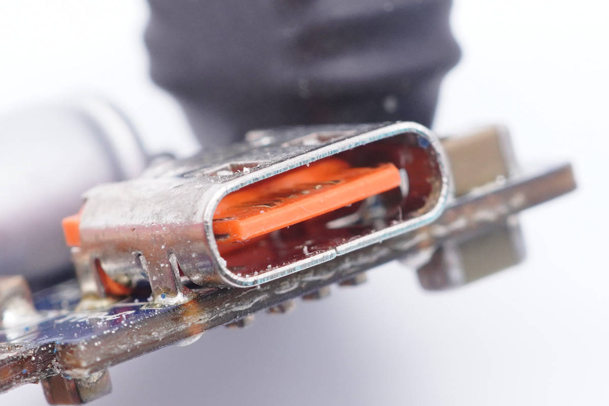 USB-C1母座特写,过孔焊接。