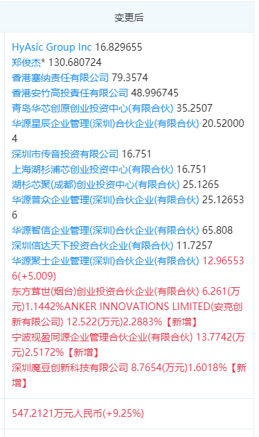 华源智信半导体本次投资方更新,新增安克创新有限公司、宁波视盈同源企业管理合伙企业、深圳魔豆创新科技有限公司等多家知名企业入股。注册资本由500.8807万元人民币变更为547.2121万元人民币,增加9.25%。