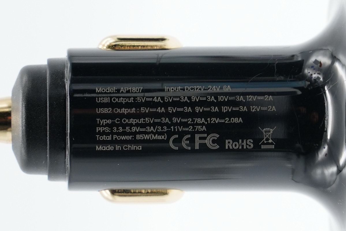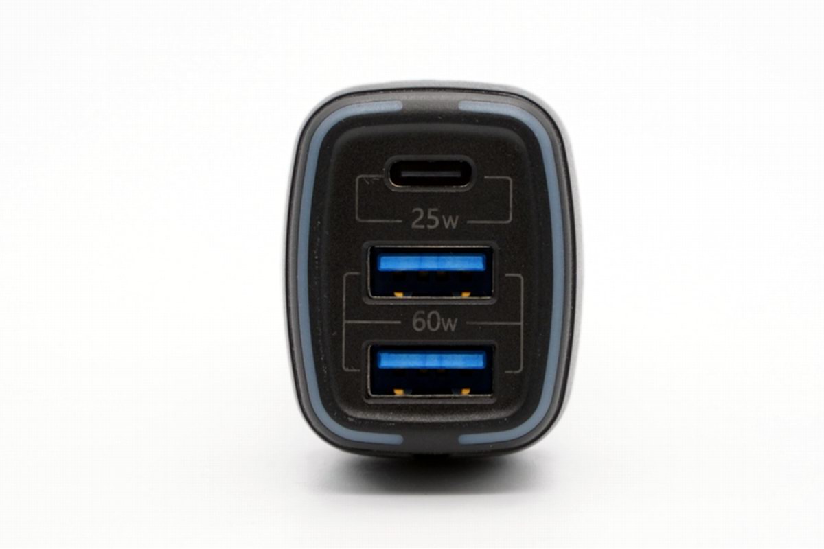 接口配置方面,艾帕85W车载充电器采用了两个USB-A加一个USB-C的搭配,也就是俗称的2A1C配置,不同接口类型兼顾了多种设备使用。输出面板上,USB-C旁边印有25W字眼,两个USB-A印有60W字眼,代表其拥有强悍的输出性能。