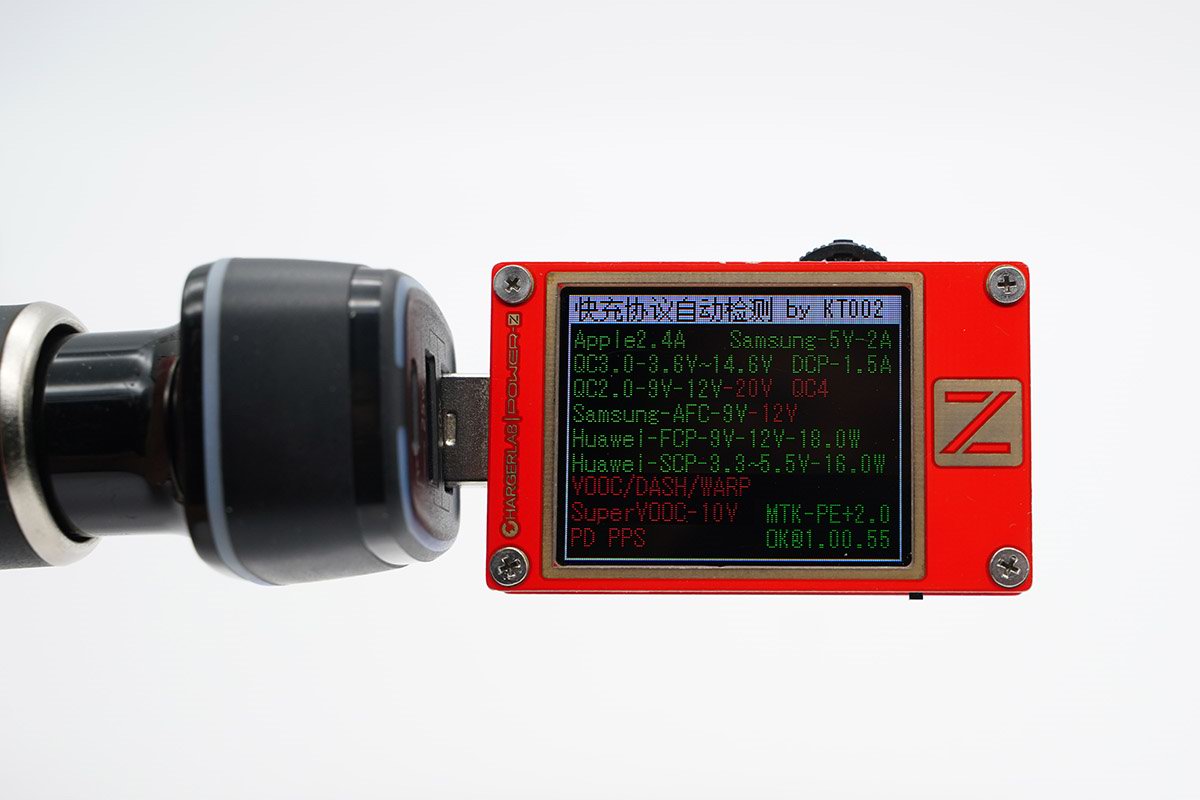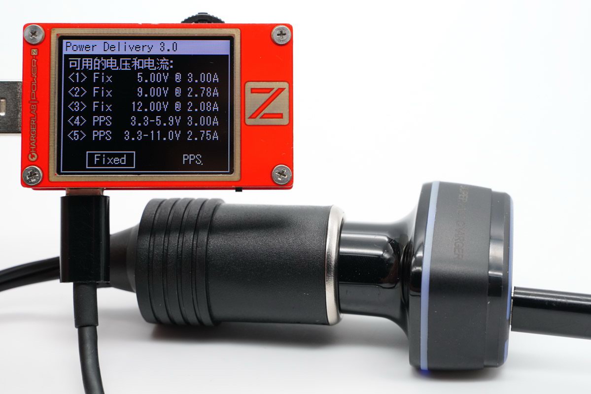 采用POWER-Z KT002 USB测试仪读取PDO报文,车载充电器于PD3.0快速充电标准开发,带有5V3A / 9V2.78A / 12V2.08A三个固定电压输出档,另外还带有3.3-5.9V3A / 3.3-11V2.75A两组PPS电压子集。