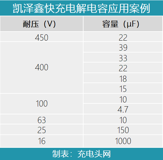 充电头网归纳了使用凯泽鑫电解电容的充电器产品,并按照耐压与容量排列。