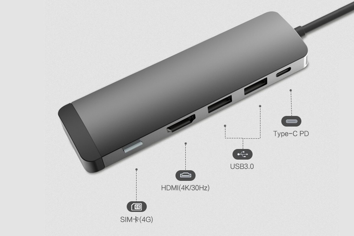 下面来简单对AJIUYU 4G上网扩展坞的接口进行介绍,带有一个SIM卡槽,一个HDMI视频输出口,两个USB-A数据接口,一个USB-C充电接口,在为用户提供4G上网的同时还带有扩展坞最常用的功能。