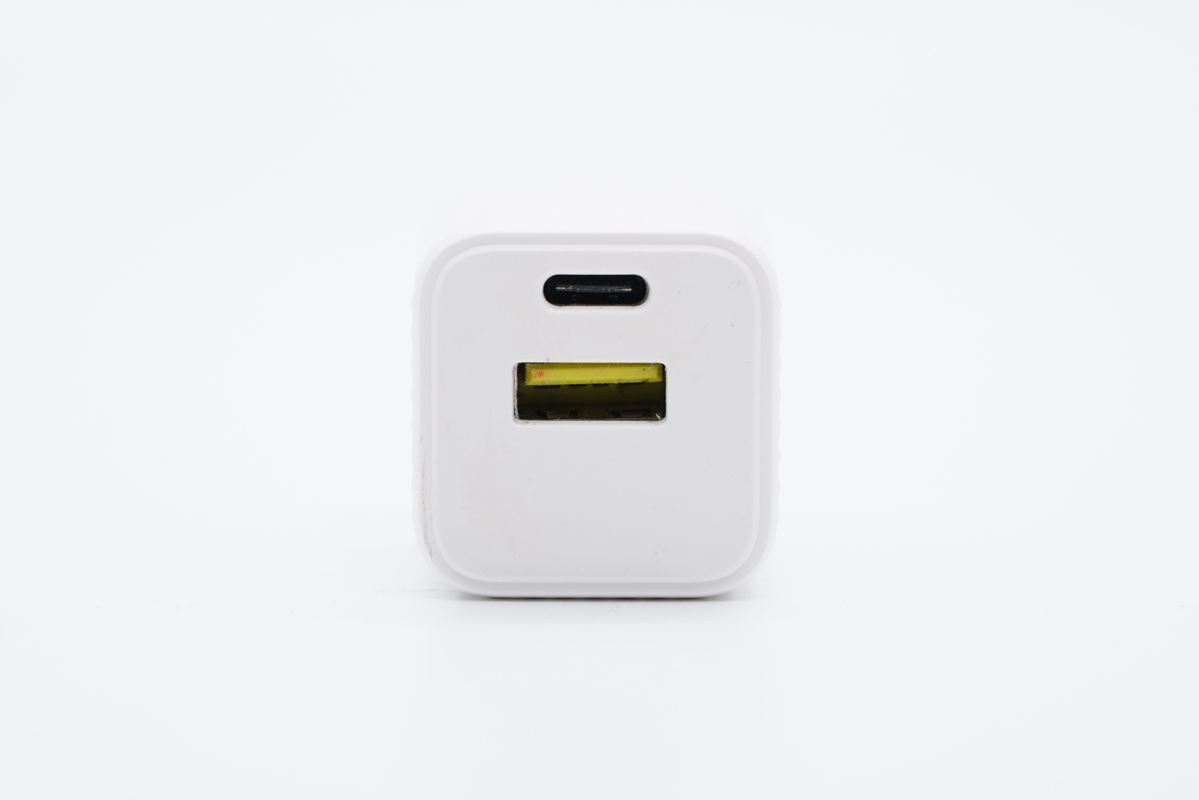 充电器配备1C1A双USB充电接口,USB-A内舌为黄色,并且内部的两侧弹片加宽设计,符合快充的特征。