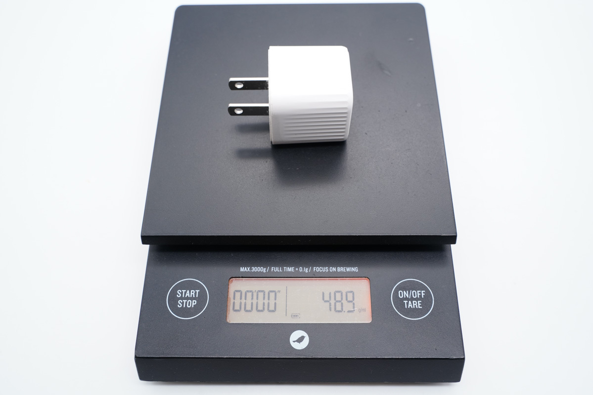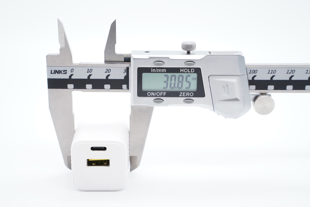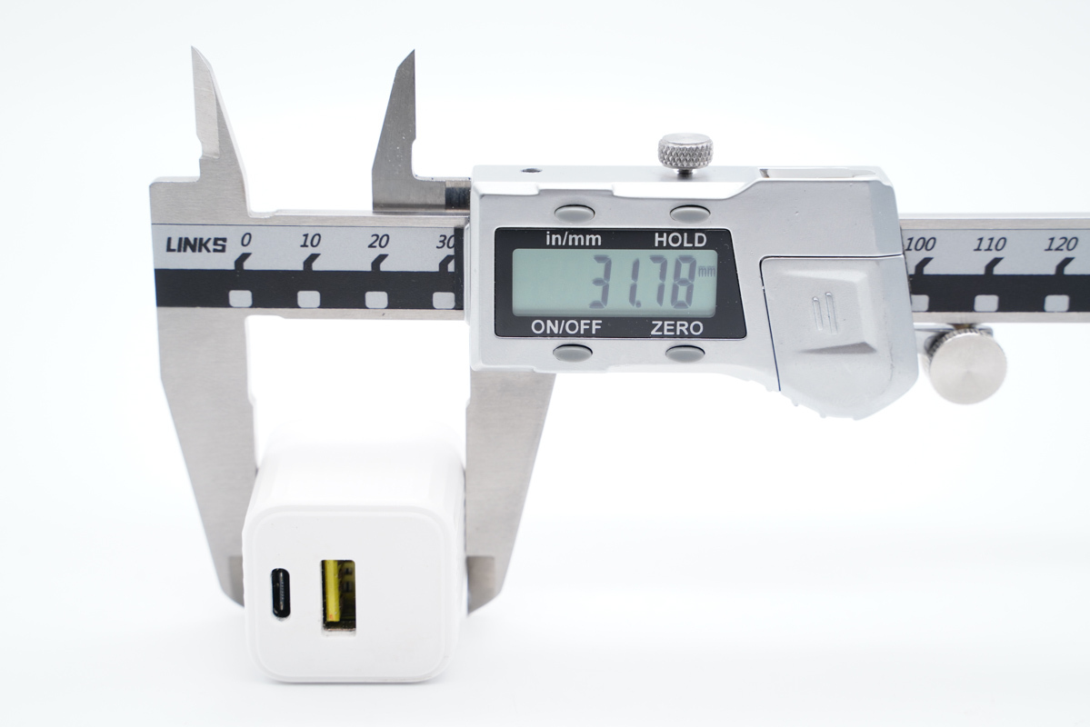 可以得出充电器的三围参数为31.45x31.78x30.85mm,充电器的体积约为30.83cm³,以最高输出33W计算,功率密度约为1.07W/cm³。