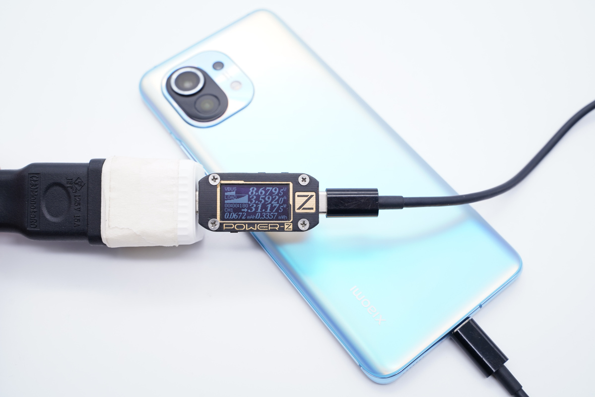 使用充电器为小米11充电,功率为8.67V 3.59A 31.17W,成功触发PPS大功率快充,并且已经达到了充电器的最大输出功率。