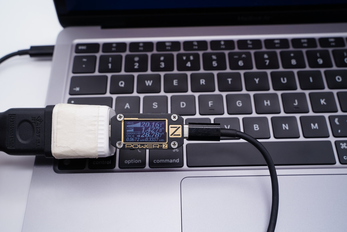 为笔记本充电可以输出20V高压快充,实测为MacBook Air M1充电功率为20.16V 1.42A 28.78W。