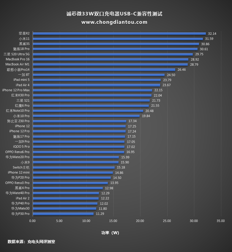 从柱状图中可以清晰的看到哪台设备的充电功率最高,可以看出功率排在第一的是坚果R2,达到了32.14W,但其他设备也可以触发PPS或大功率PD快充,所以整体看上去差距并不明显。