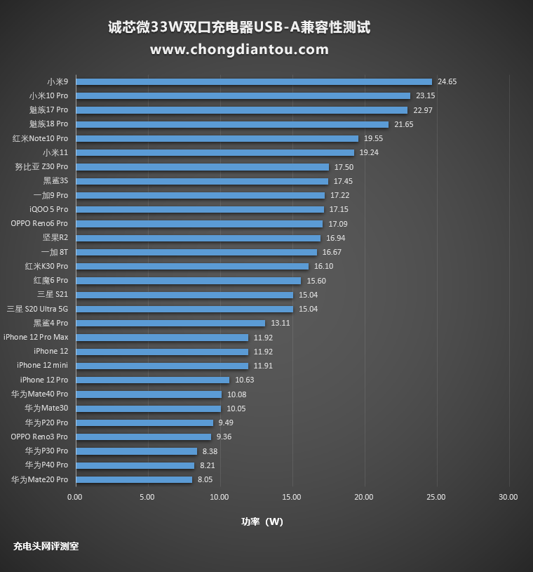 从柱状图中可以看出小米9的功率最高,整个功率柱状图的走向较为平缓,大部分设备处于快充状态。