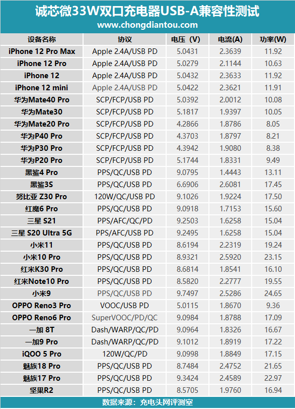 测试数据汇总,USB-A对于iPhone可以提供12W左右的快充功率,其他安卓机型大部分可以触发QC快充。