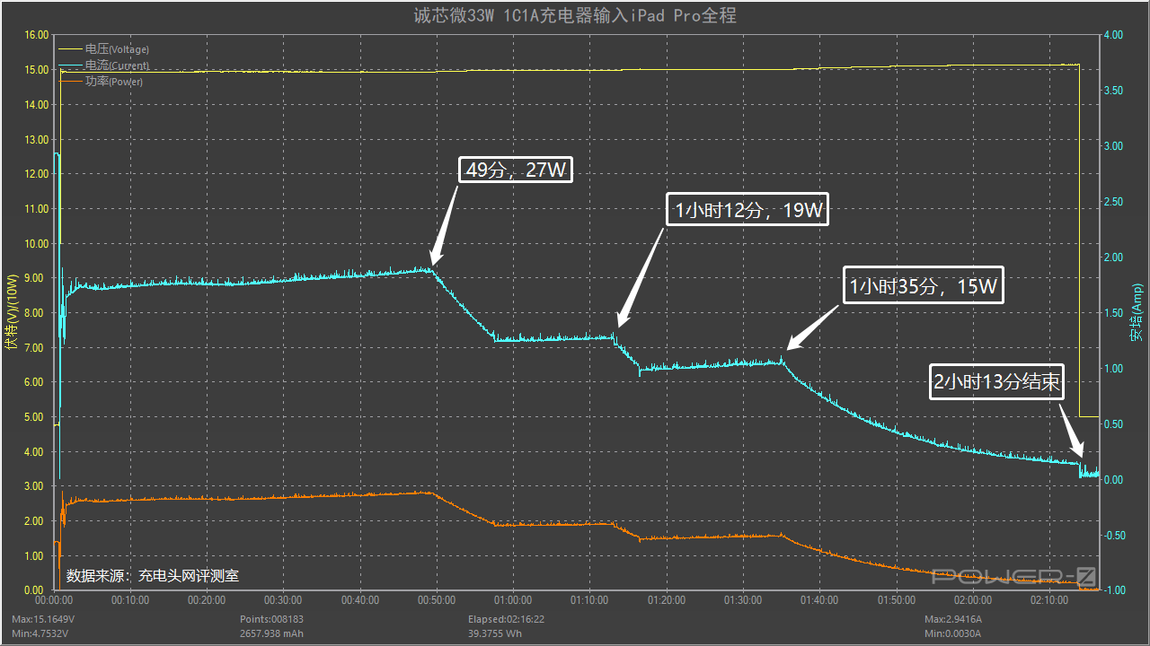 以上是使用充电器的USB-C为iPad Pro充电全程的实测数据,全程共分为四个阶段,于2小时13分结束。