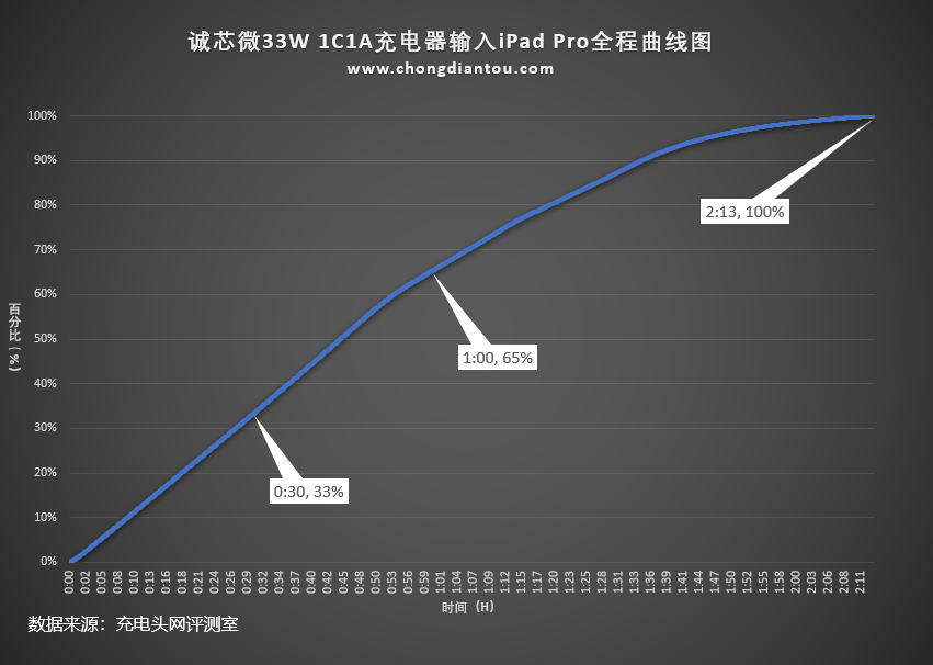 将充电全程绘制成曲线图,可以看到充电器为iPad Pro半小时充电33%,1小时充电65%,完全充满需要2小时13分。