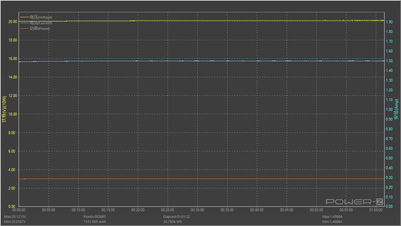对充电器在长时间满载的情况下是否可以稳定输出进行测试,按照额定功率20V 1.5A 30W满载对充电器进行稳定性测试,测试时间为一小时,测试过程中电压值呈水平直线,无明显波动情况,长时间满载也比较稳定。