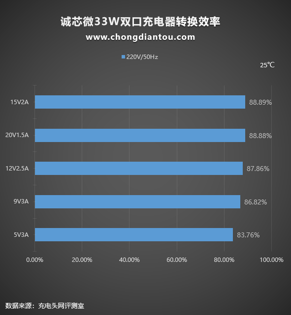 220V 50Hz下,将诚芯微33W双口氮化镓充电器在各个电压档位的输出功率拉满进行测试:五个档位测得插线板AC端输入功率和USB端输出功率,通过计算,可得充电器的转换效率从83.76%到88.89%不等。