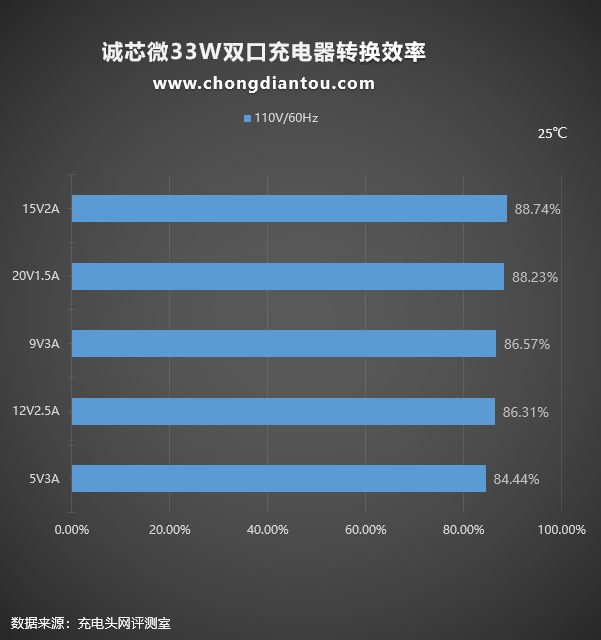 110V 60Hz下,充电器的转换效率从84.44%到88.74%不等。