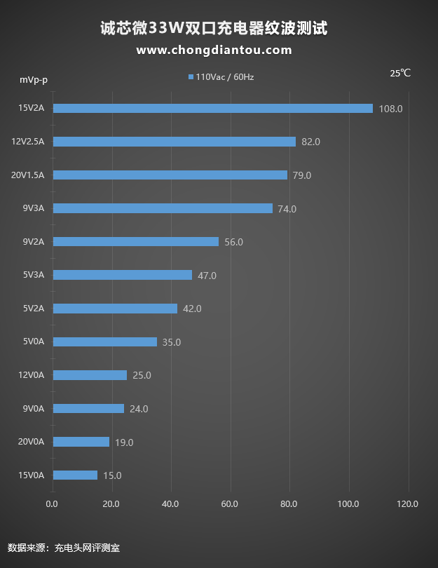 110V 60Hz下,纹波最高为108mVp-p,充电器处于15V2A输出状态;最低为15mVp-p,充电器处于15V0A空载状态。