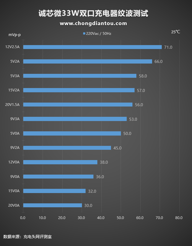 这是使用诚芯微33W双口氮化镓充电器在220V 50Hz交流输入下的纹波测试,纹波测试分为空载(柱状图中Y轴电流为0A)和重载(柱状图中Y轴电流为非0A)两种。纹波最高为71mVp-p,充电器处于12V2.5A输出状态;最低为30mVp-p,充电器处于20V0A空载状态。