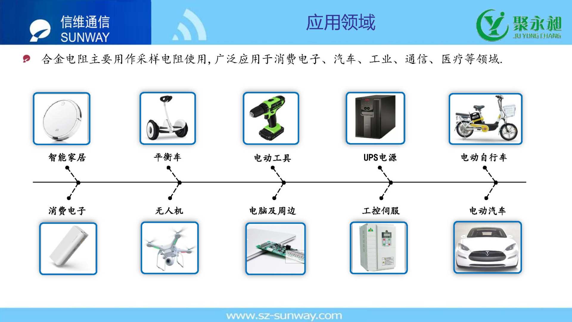聚永昶合金电阻在实际应用中主要用于电流采样,广泛应用于智能家居、消费电子、平衡车、无人机、电动工具、电脑机周边、UPS、工控伺服、电动自行车、电动汽车、工业、通信、医疗等领域。