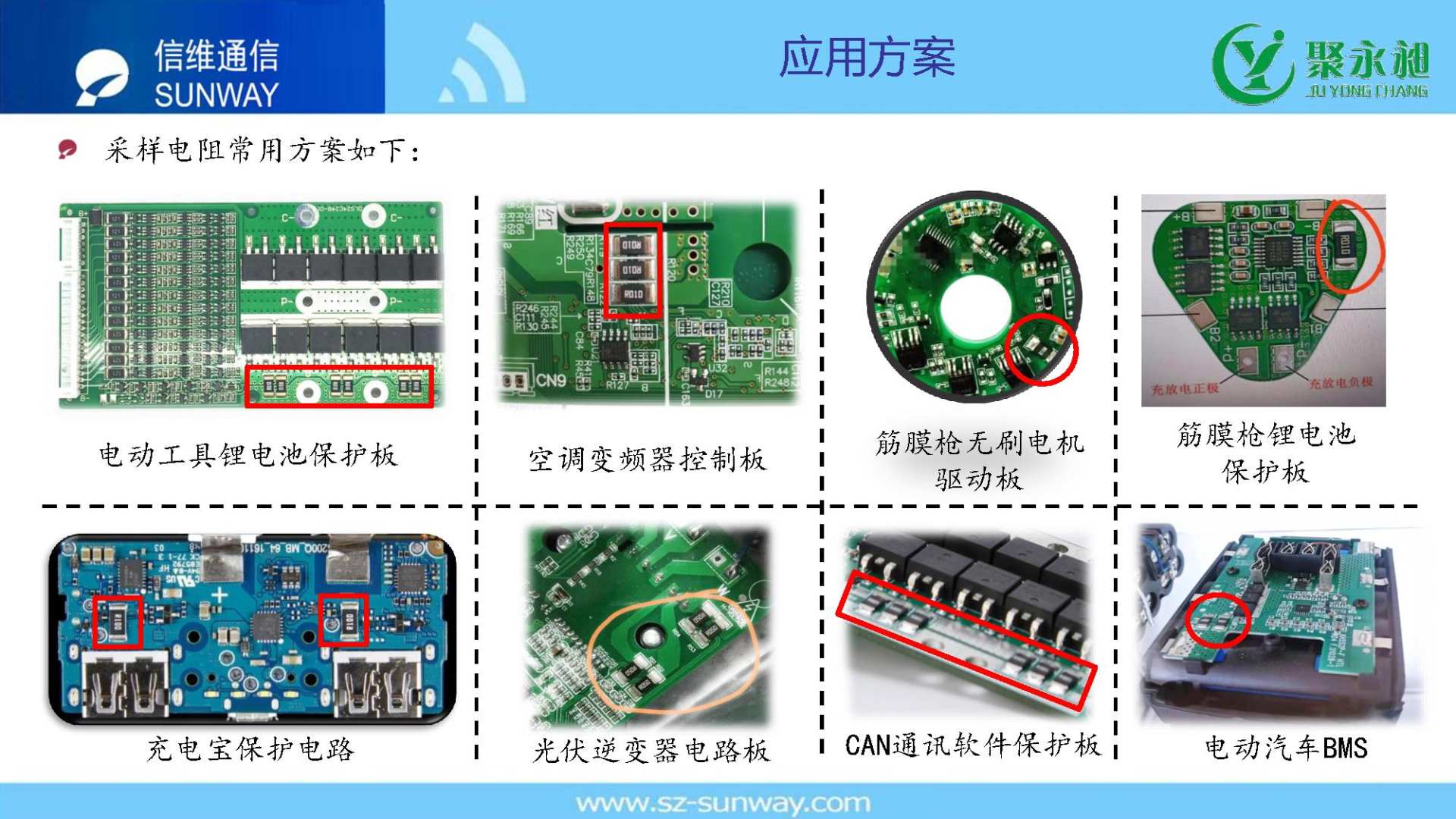 聚永昶合金电阻可用于电动工具内部锂电池保护板、空调变频器控制板、筋膜枪无刷电机驱动板、筋膜枪锂电池保护板、充电宝保护电路、光伏逆变器电路板、电动汽车BMS等应用。用于电路电流采集,实现保护功能。