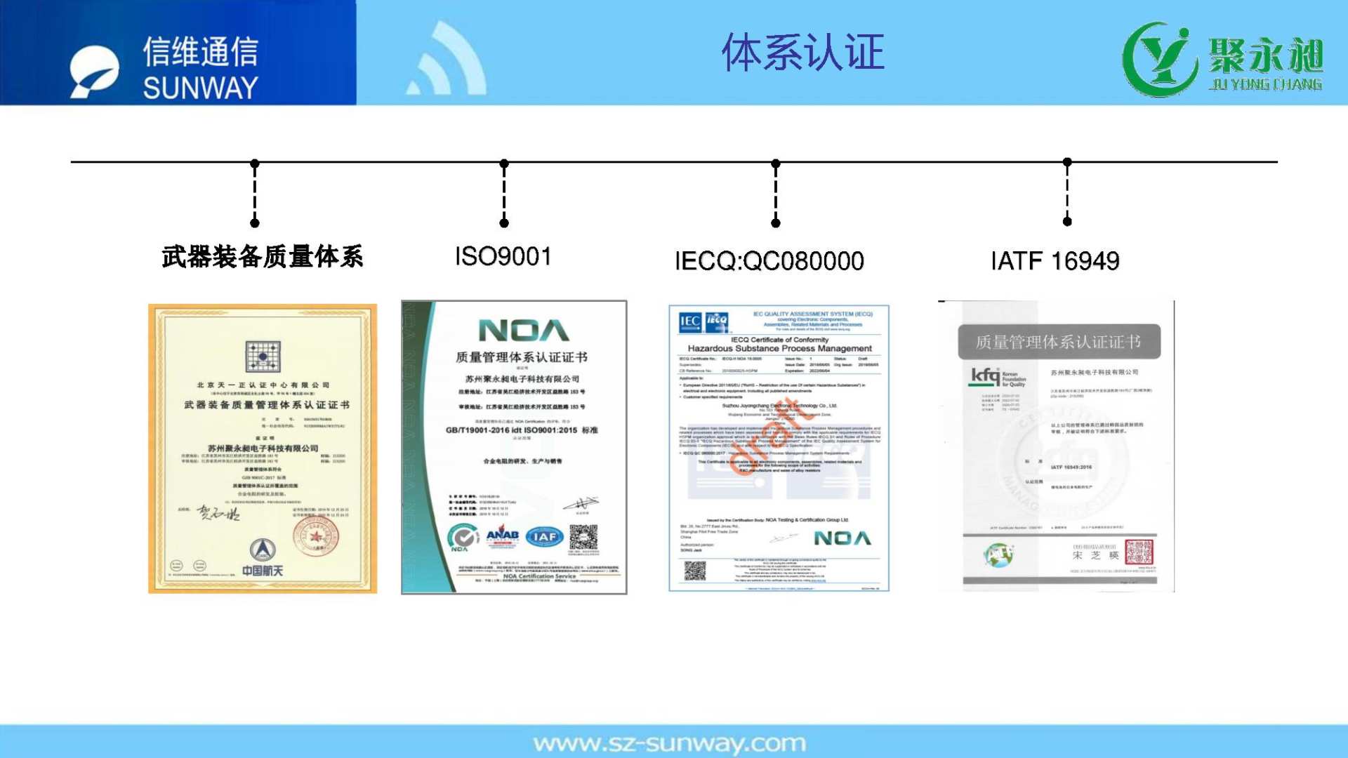 聚永昶已经通过了武器装备质量体系、ISO9001、IECQ:QC080000、IATF 16949认证。