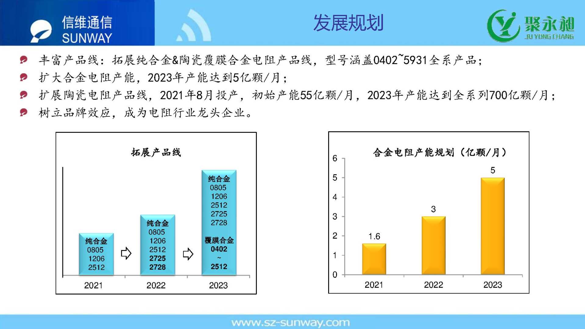 聚永昶目前产品为0805、1206和2512合金电阻,计划在2022年拓展2725和2728封装大功率合金电阻,到2023年增加高精度低温漂金属箔电阻产品线,并将合金电阻产能拓展到5亿颗/月。陶瓷贴片电阻产品线于2021年8月投产,初始产能为55亿颗/月,2023年产能达到全系列700亿颗/月。