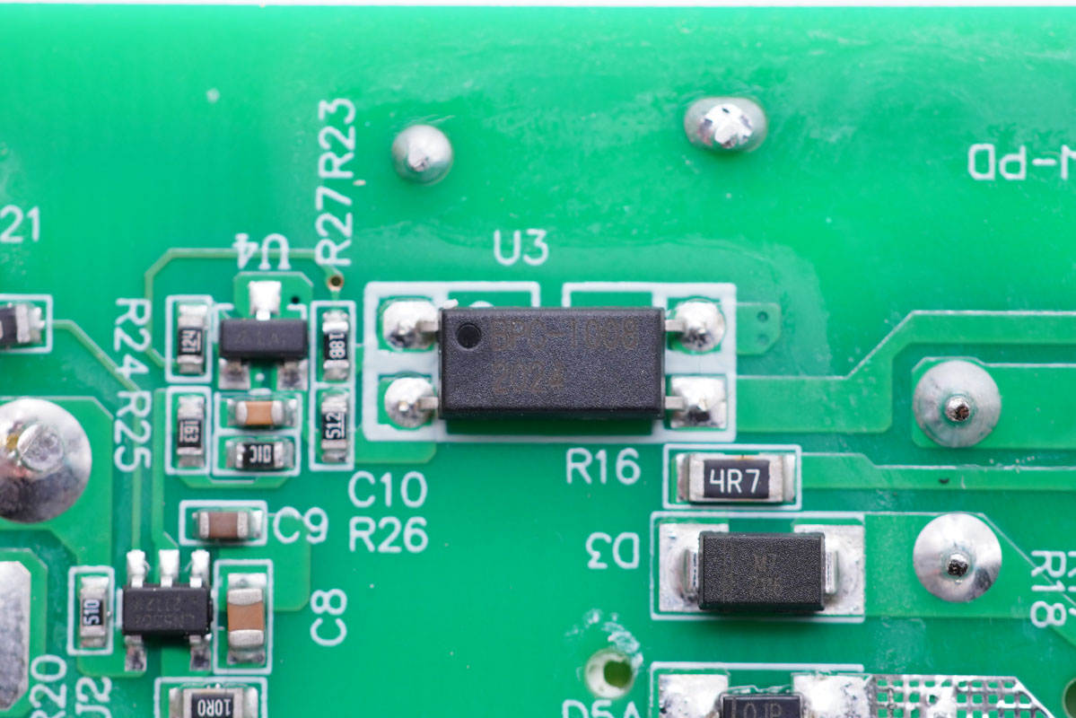 板子背面一览,左侧设有继电器电路控制芯片,右侧设有开关电源初次级控制器、光耦和贴片Y电容。
