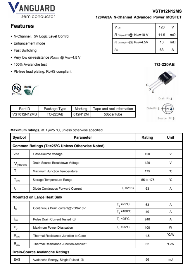 同步整流管采用威兆半导体VST012N12MS,NMOS,耐压120V,TO-220AB封装。