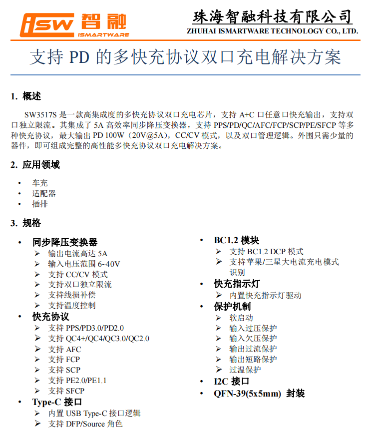 SW3516H集成了5A 高效率同步降压变换器。支持PPS/PD/QC/AFC/FCP/SCP/PE/SFCP等多种快充协议,最大输出PD 100W,CC/CV模式,以及双口管理逻辑。外围只需少量的器件,即可组成完整的高性能多快充协议双口充电解决方案。