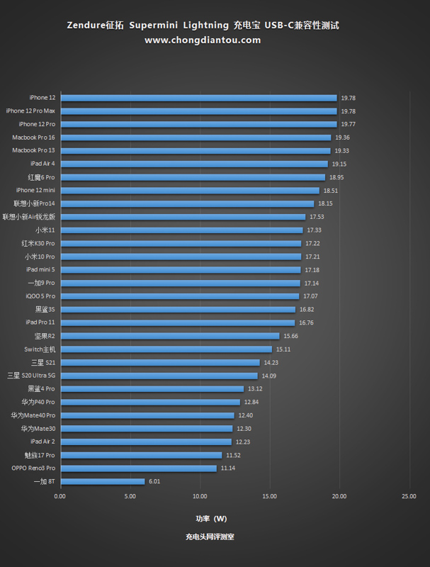 将输出功率汇总成表,可以看到对 iPhone 12系列的支持非常好,均能达到19W左右,对其他支持PD充电协议的手机也能达到18W左右,只是对一加 8T 的兼容性较差一些。