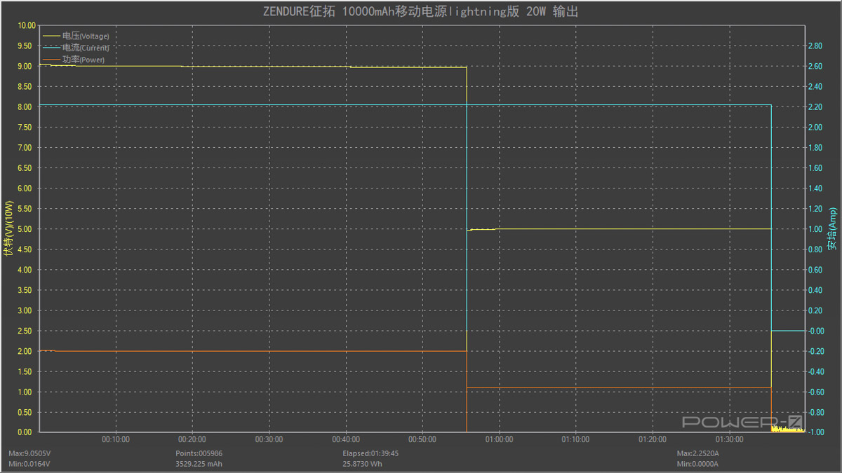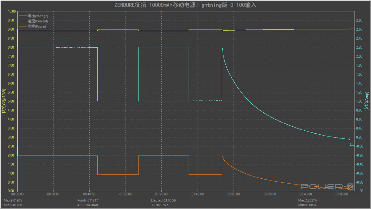 使用9V2.22A PD档位对充电宝进行输出效率测试,充电功率在36分钟左右就从20W掉到11W左右,全程持续约1小时50分钟。