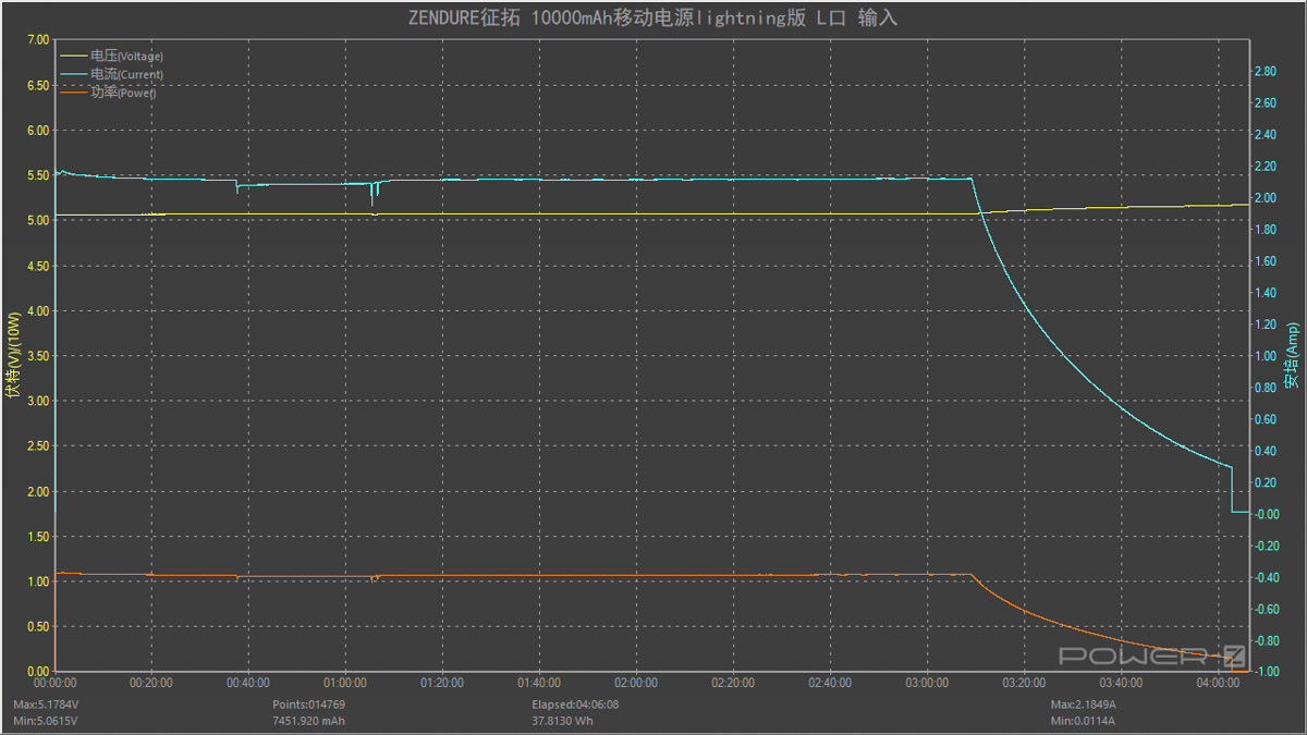 通过 Lightning 接口为充电宝充电,全程约耗时4小时06分,前3小时08分充电功率在10W左右,之后功率随着充电宝电量增多逐渐降低。