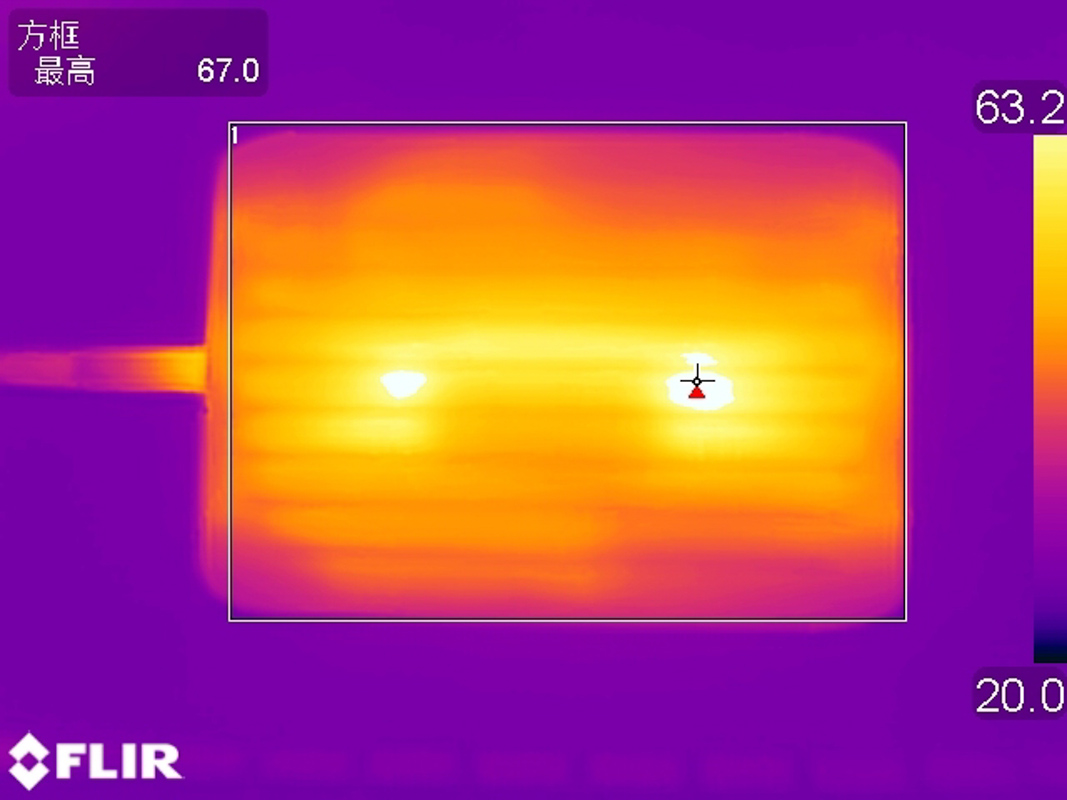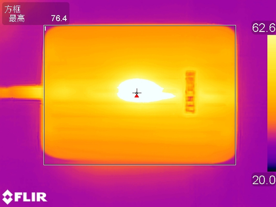 正面最高温度集中在充电宝中心区域,最高76.4℃,这也是主板所在的位置。