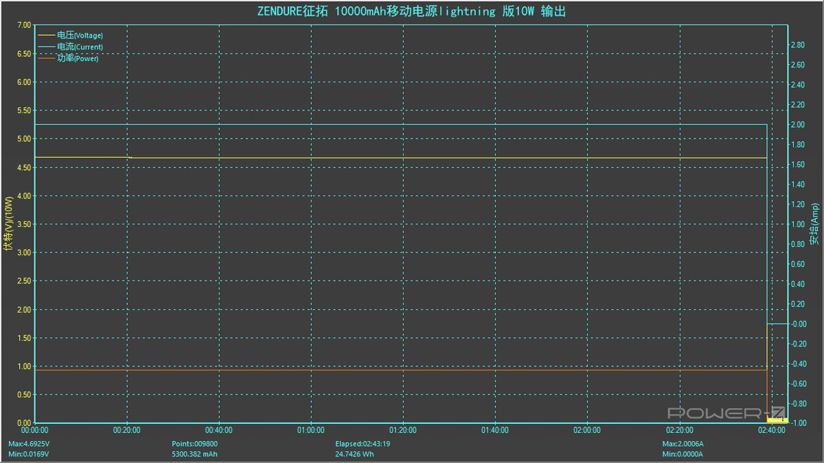 使用5V2A 档位对充电宝进行输出效率测试,整个输出过程平稳,持续约2小时40分钟,测试放出电量为24.7426Wh,所以在10W输出测试中输出效率约为24.7426Wh/36Wh=68.73%。