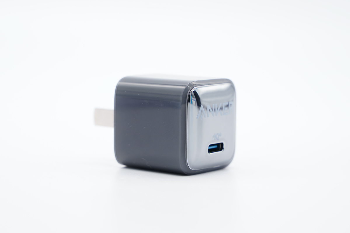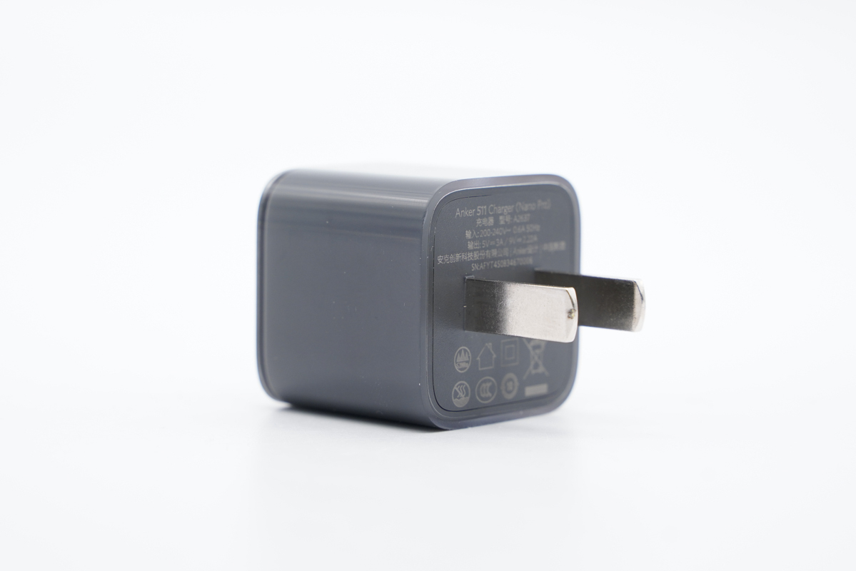接口面板采用了磨砂的设计风格,但曜石黑的接口面板为亮面。Anker的品牌Logo占据了接口面板的大块面积,下面是蓝色内舌的USB-C充电接口,从IQ3的标识也可以得知充电器搭载了Anker安克独有的PowerIQ智速充功能。