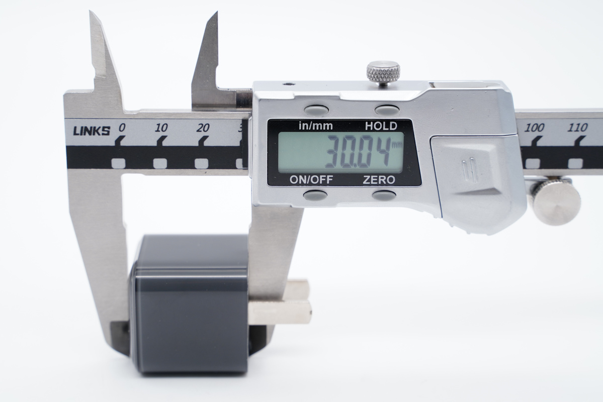 体积方面使用卡尺实测充电器的长度约为30.04mm(不含插脚)。