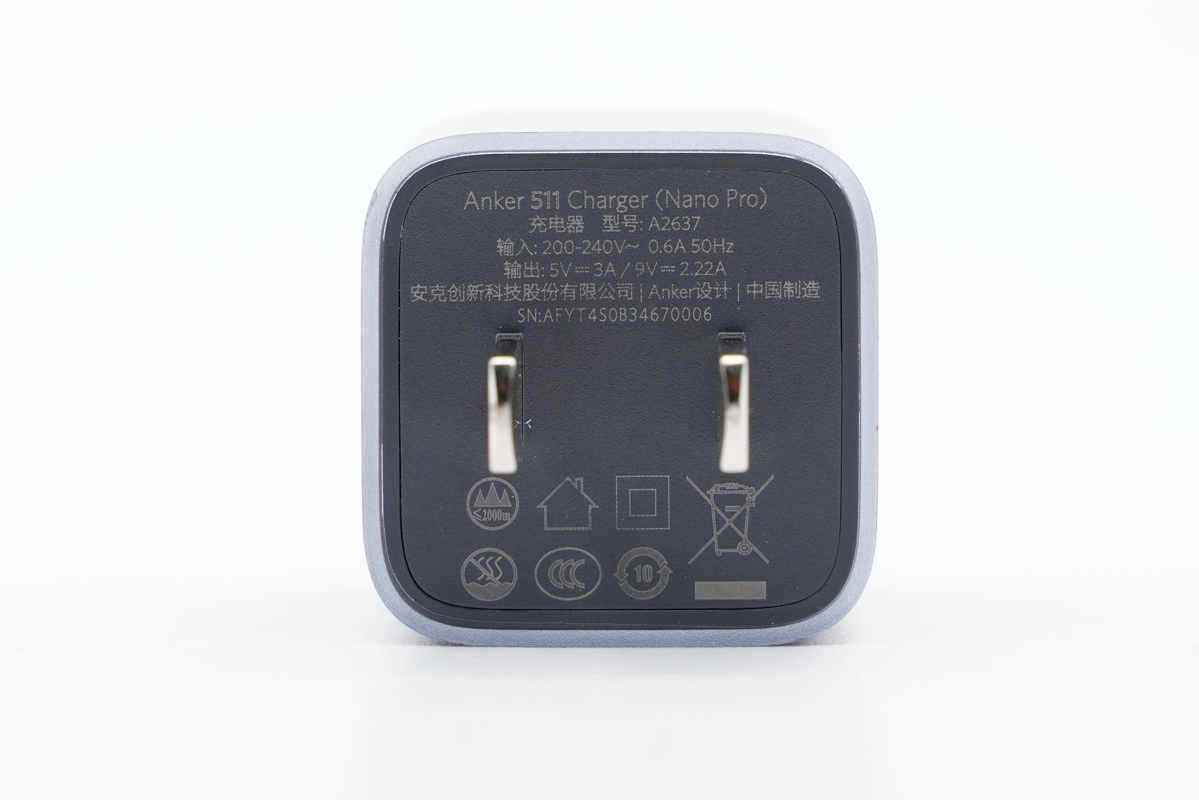 Anker安克安芯充的型号为A2637,支持200-240V的输入电压,支持5VA、9V2.22A输出。安克创新科技股份有限公司,Anker设计,中国制造。