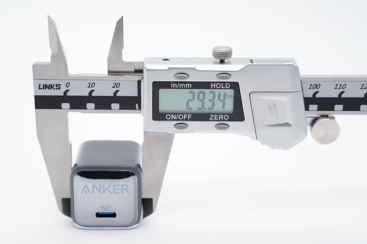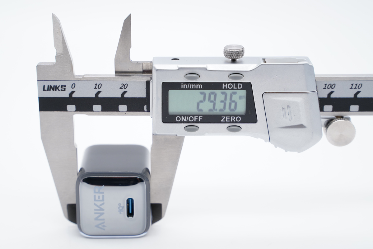 由此可以得出充电器的三围参数为30.04x29.34x29.36mm,体积约为25.87cm³,以最高输出20W计算,功率密度约为0.7W/cm³。