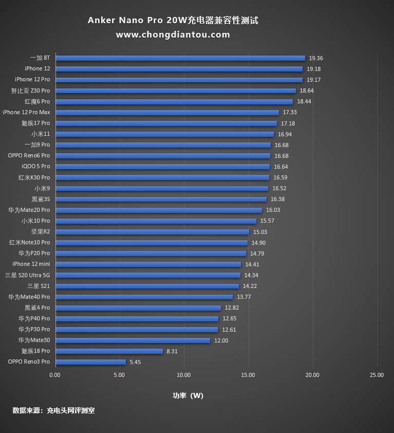 柱状图这里,因为充电器的最大输出功率为20W,所以整体上看区别不大,柱状图走向较为平缓。