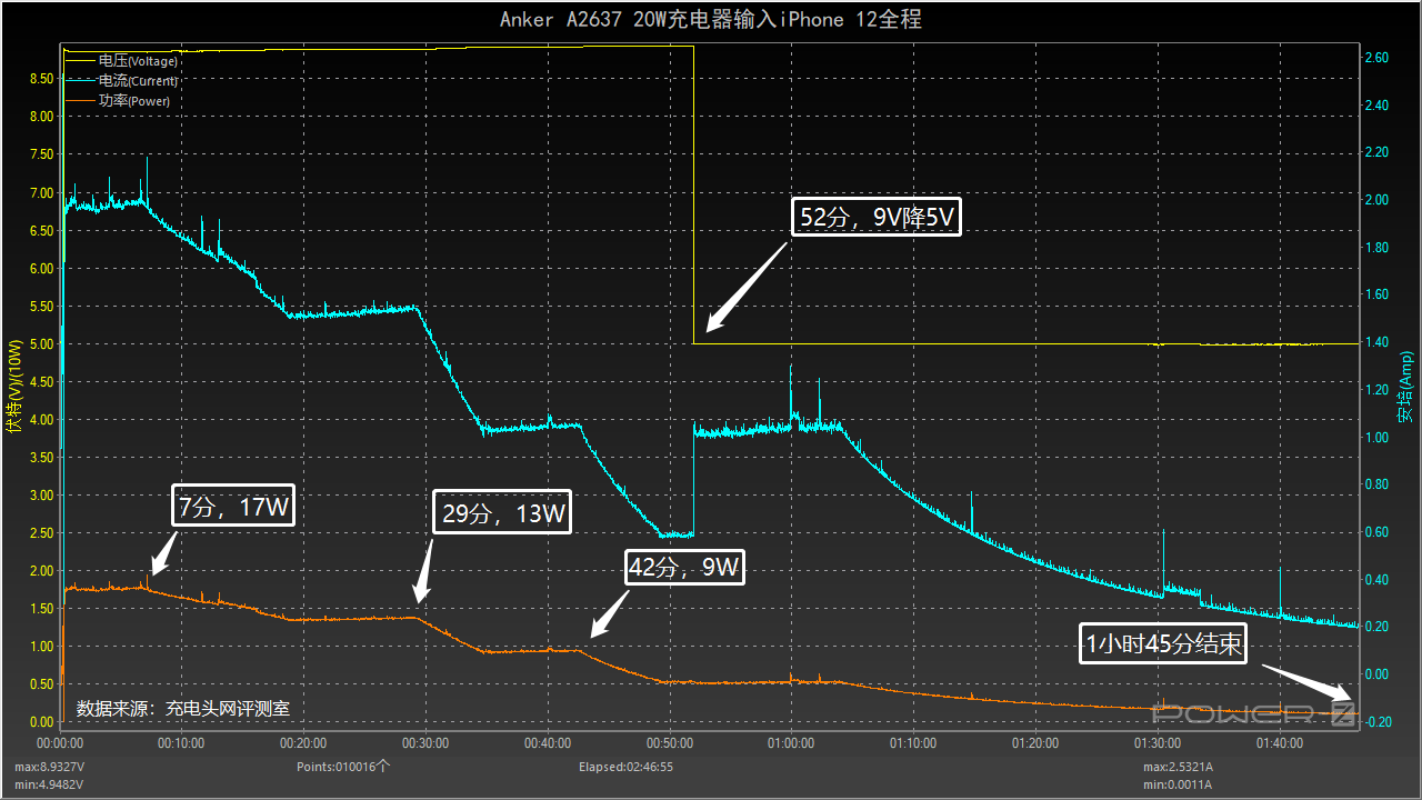 除了充电兼容性外当然还对充电全程进行了测试,这是为iPhone 12充电的全程数据,测试于1小时45分结束。