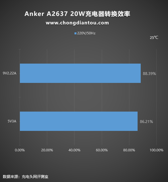 220V 50Hz下,将Anker安克安芯充在各个电压档位的输出功率拉满进行测试:两个档位测得插线板AC端输入功率和USB端输出功率,通过计算,可得充电器的转换效率从86.21%到88.39%不等。