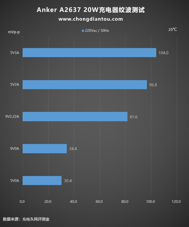 这是使用Anker安克安芯充在220V 50Hz交流输入下的纹波测试,纹波测试分为空载(柱状图中Y轴电流为0A)和重载(柱状图中Y轴电流为非0A)两种。纹波最高为104mVp-p,充电器处于5V3A输出状态;最低为30.4mVp-p,充电器处于5V0A空载状态。