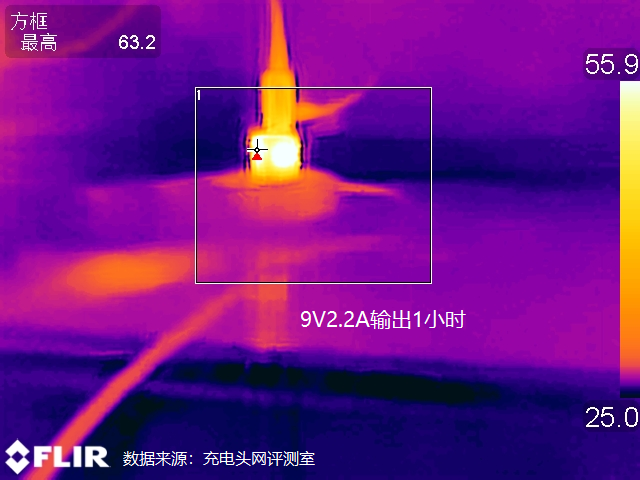 前面之所以会有转换效率的问题是因为充电器在功率转换时会有损耗,损耗的部分以热量的形式散发出去,所以此次也增加了对充电器温度方面的测试。测试条件为让充电器以9V2.22A 20W的功率输出1小时后采集温度,测试基于25℃的恒温箱内进行。
