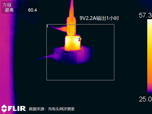 让充电器以20W的功率持续满载输出1小时后采集到充电器表面的最高温度为60.4℃。
