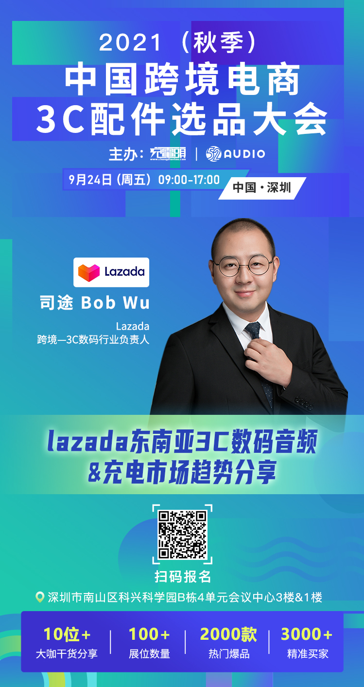 2021(秋季)中国3C跨境电商选品大会将于9月24日在深圳南山科兴科学园举办,Lazada跨境—3C数码行业负责人司途 Bob Wu先生将出席本次展会并发表演讲,演讲主题为:《Lazada东南亚3C数码音频&充电市场趋势分享》。